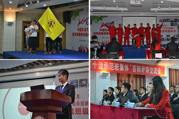 評審現(xiàn)場,候選班級根據(jù)抽簽順序依次上臺通過視頻和現(xiàn)場答辯的形式展示了包括思想建設(shè)、學(xué)風(fēng)建設(shè)、班風(fēng)建設(shè)等在內(nèi)的班集體建設(shè)成果和特色班級文化,呈現(xiàn)出團結(jié)向上的精神風(fēng)貌,體現(xiàn)了石大基層班級強大的凝聚力和向心力。最終,石工13-7創(chuàng)新班、安全13-1班、石工14-7創(chuàng)新班、英語13-2班、材料15-2班、化工15-5創(chuàng)新班、物探14-2班、勘查13-4班、環(huán)科13-1班、化工13-3卓越班榮獲石大2016年“十佳示范班集體”榮譽稱號。學(xué)校將按照答辯評審排名順序推薦相應(yīng)班級參加2016年北京高校優(yōu)秀學(xué)生基層組織創(chuàng)建展示活動。