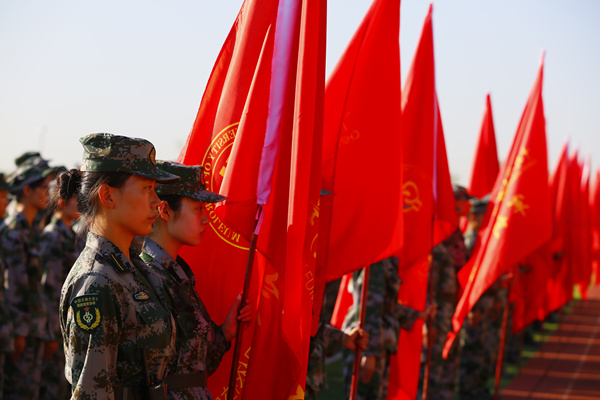 上午10點(diǎn),軍訓(xùn)開(kāi)訓(xùn)典禮在莊嚴(yán)激昂的國(guó)歌聲中拉開(kāi)了序幕,陳桂剛向軍訓(xùn)團(tuán)授旗。