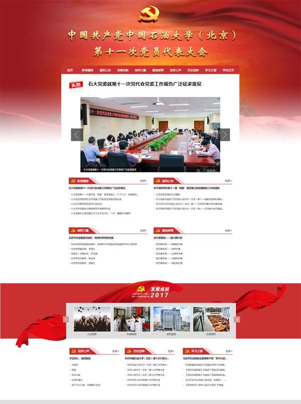 為迎接中國(guó)共產(chǎn)黨中國(guó)石油大學(xué)(北京)第十一次黨員代表大會(huì)的召開,全面展示中國(guó)石油大學(xué)(北京)第十次黨代會(huì)以來學(xué)校各項(xiàng)事業(yè)所取得的發(fā)展成就,使廣大師生及時(shí)便捷地了解第十一次黨代會(huì)籌備工作進(jìn)展和大會(huì)召開期間的重要新聞,由黨委宣傳部、信息中心聯(lián)合策劃制作的“中國(guó)共產(chǎn)黨中國(guó)石油大學(xué)(北京)第十一次黨員代表大會(huì)專題網(wǎng)”今天正式上線。
