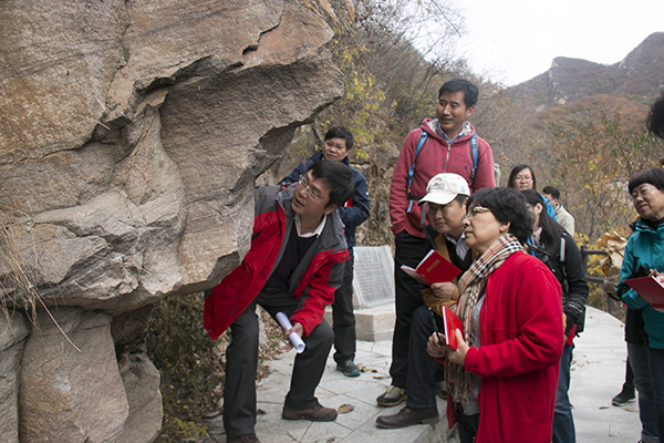 10月28日,實踐團一行赴薊縣國家地質公園中上元古界剖面保護區進行了考察。地球科學學院教授季漢成、王貴文對剖面的構造、沉積現象進行了講解,針對疊層石類型、地層沉積環境、斷層發育特征等現象與青年教師們展開熱烈討論。