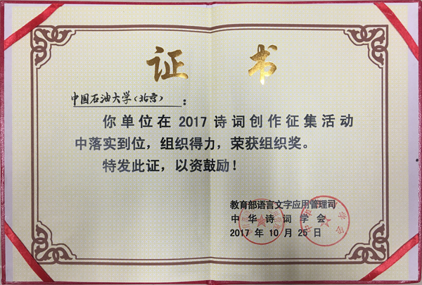 石大在教育部2017詩詞創作征集活動中榮獲組織獎