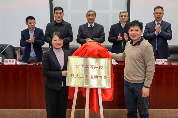 董朝霞和陳笑然共同為全國高等院校鐵人三項(xiàng)運(yùn)動(dòng)協(xié)會(huì)揭牌。