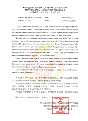 近日,中國(guó)石油大學(xué)蒙古校友會(huì)在蒙古國(guó)烏蘭巴托正式注冊(cè)成立,并向母校發(fā)來65周年校慶賀信。