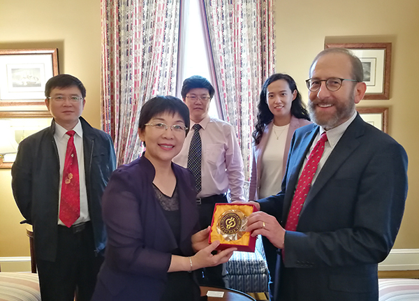 黨委書記山紅紅向哈佛大學(xué)教務(wù)長艾倫·嘉伯(Alan Garber)贈送石大紀(jì)念品