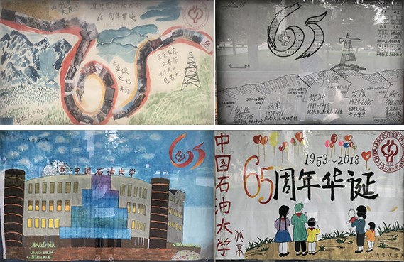 活動中,機械與儲運工程學院的作品《龍飛鳳舞》描繪了在沙漠、戈壁、雪山、草原環境下進行石油開采工作的場景,闡釋了《我為祖國獻石油》壯闊豪邁的意境,并以學校65周年校慶標識的形狀展示了學校的發展歷程;地球科學學院的作品 《地質與石大》將素描清繪的地質構造圖與學校歷史相結合,勾勒出學校“創業”“求索”“彌新”“發展”“騰飛”的階段,以地質人特有的方式祝福學校65周年校慶;其它各學院(研究院)也提交了優秀代表作品,表達了石大學子對母校的熱愛之情。