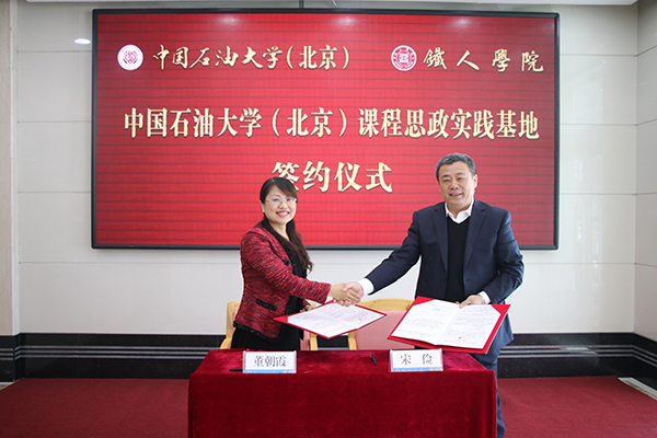 董朝霞與宋儉分別代表雙方簽署戰(zhàn)略合作協(xié)議,并共同為“中國石油大學(xué)(北京)課程思政實踐基地”揭牌。