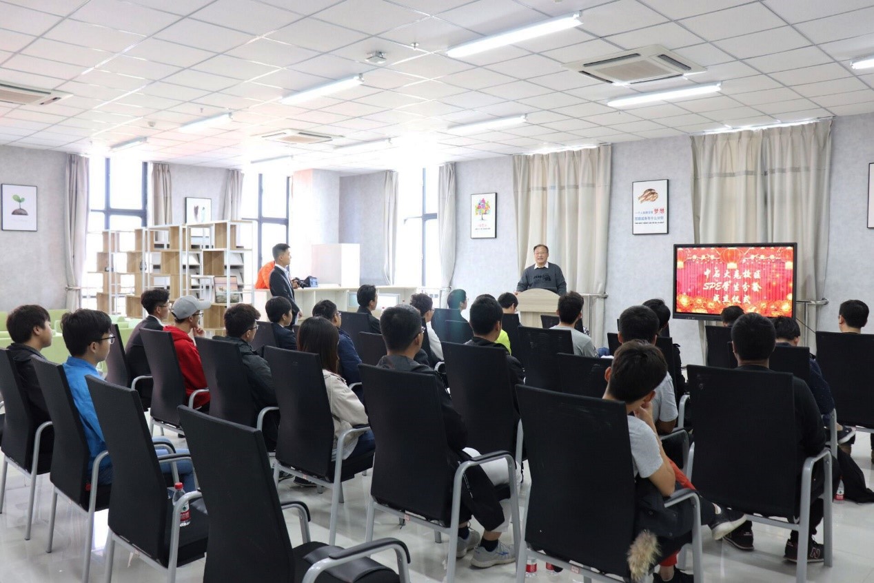 校區(qū)SPE學(xué)生分會負責人孫照偉詳細介紹了分會成立背景、創(chuàng)辦目的、創(chuàng)辦意義及分會活動計劃等內(nèi)容,激發(fā)了石大學(xué)生加入分會的激情。