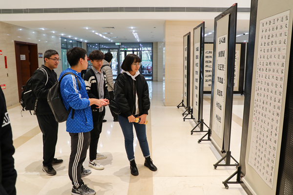 為深入學(xué)習(xí)宣傳習(xí)近平新時(shí)代中國(guó)特色社會(huì)主義思想和黨的十九大精神,展示中華優(yōu)秀傳統(tǒng)文化的博大精深,由石大黨委宣傳部舉辦的“執(zhí)古之道 御今之有——王修齋教授習(xí)近平治國(guó)理政用典書(shū)法作品展”在主樓A座一層大廳“風(fēng)華藝苑”開(kāi)展。11月6日下午,黨委書(shū)記山紅紅,相關(guān)職能部門負(fù)責(zé)人,院級(jí)單位黨組織書(shū)記、副書(shū)記,學(xué)生代表等參觀了展覽。