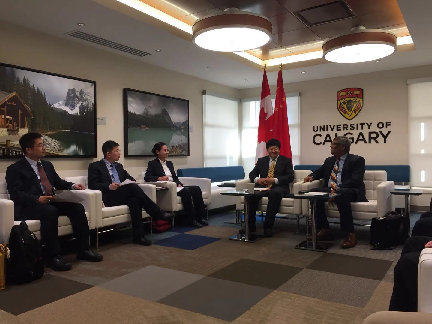 在卡爾加里大學,李根生一行與卡爾加里大學主管國際交流的副校長賈納卡·盧旺普拉(Janaka Ruwanpura), 國際交流主管雪莉·杜克(Cheryl Dueck), 工學院副院長孫喬(Sun Qiao),工學院教授伊恩·蓋茨(Ian Gates), 理學院副院長辛迪·格翰姆(Cindy Graham), 國際處學生項目負責人凱文·埃伍德(Kevin Ellwood), 法律事務處國際協議負責人南希·歐森(Nancy Olson), 以及國際處亞洲區負責人劉景昌(Jingchang Liu)分別進行了會談,雙方就細化世界能源大學聯盟章程、在聯盟下開展具體合作、聯合雙碩士項目、學生訪問項目等方面進行了商談,同意率先舉行聯盟研討會,促進雙方教授之間的交流,為今后開展聯合科研等建立良好的基礎。雙方同意于2019開始雙碩士項目招生;同意開展學生訪學項目。