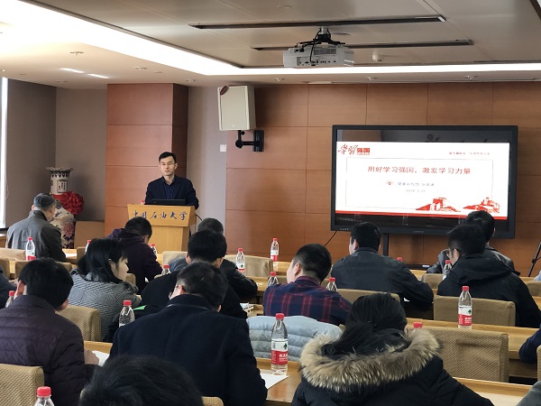 3月21日,由石大機關黨委主辦、宣傳部黨支部承辦的第七期“午間文化沙龍”活動在主樓A1402會議室舉行。黨委宣傳部副部長張延港作了題為“用好‘學習強國’、激發學習力量”的專題講座,70余名機關黨員干部參加活動。活動由機關黨委書記趙慶海主持。