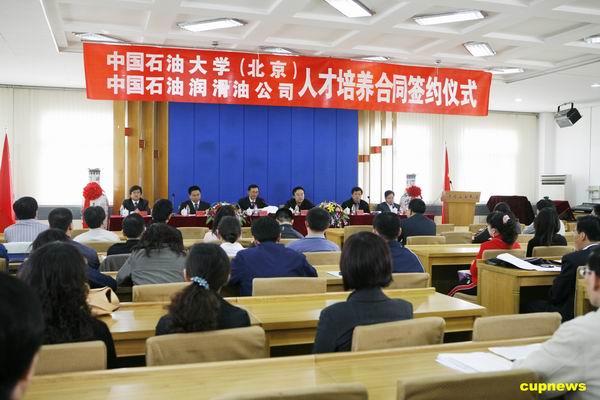 4月15日上午,中國石油大學(北京)與中國石油潤滑油公司人才培養合同簽約儀式暨開學典禮在第四會議室舉行。中國石油潤滑油公司黨委書記梁國藩、人力資源處處長姜衛華,我校校長張來斌、研究生院副院長徐懷民、化工學院分黨委書記郭紹輝、工商管理學院院長王震及潤滑油班工業工程、項目管理及化學工程三個專業的近60名同學參加了典禮。