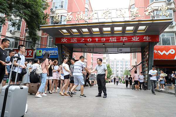 為歡送2019屆畢業(yè)生安全、文明、有序離校,6月26日至29日,中國(guó)石油大學(xué)黨政辦公室、學(xué)生工作部(處)和研究生工作部聯(lián)合開(kāi)展了2019屆畢業(yè)生離校送站工作。校長(zhǎng)張來(lái)斌,黨委副書(shū)記、副校長(zhǎng)韓尚峰,相關(guān)職能部門(mén)負(fù)責(zé)人來(lái)到潤(rùn)杰學(xué)生公寓西門(mén),為即將告別母校、踏上人生新征程的石大學(xué)子送上親切的問(wèn)候和深深的祝福。