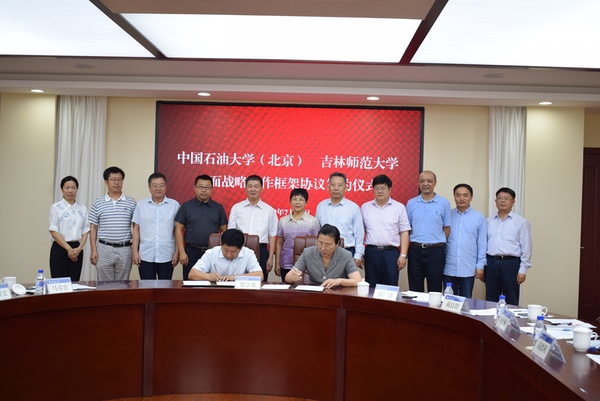 吳小林與張作嶺分別代表兩校簽署了《中國石油大學(北京)與吉林師范大學全面戰略合作框架協議》,雙方將進一步推動在學科建設、人才培養、科學研究、文化傳承與創新、國際合作交流等方面的合作,建立長期全面合作關系,實現優勢互補、互惠雙贏和共同發展。