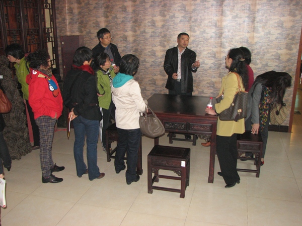 在總經理吳新建的帶領下,大家對勁飛紅木家具廠進行了參觀。在參觀過程中,吳新建向大家詳細介紹了辨別海南黃花梨、印度小葉紫檀、老撾紅酸枝等多種名貴樹種的基本知識以及我國明清古典家具的不同風格和特點。大家還參觀了紅木家具開料,雕刻,組裝,和打磨車間,親眼看到了整個紅木家具的工藝制造過程。通過參觀,大家認識到,紅木家具是我國的歷史文化及工人的精湛技藝完美結合,對大自然賦予人類的財富和人類的聰明智慧無不感嘆。