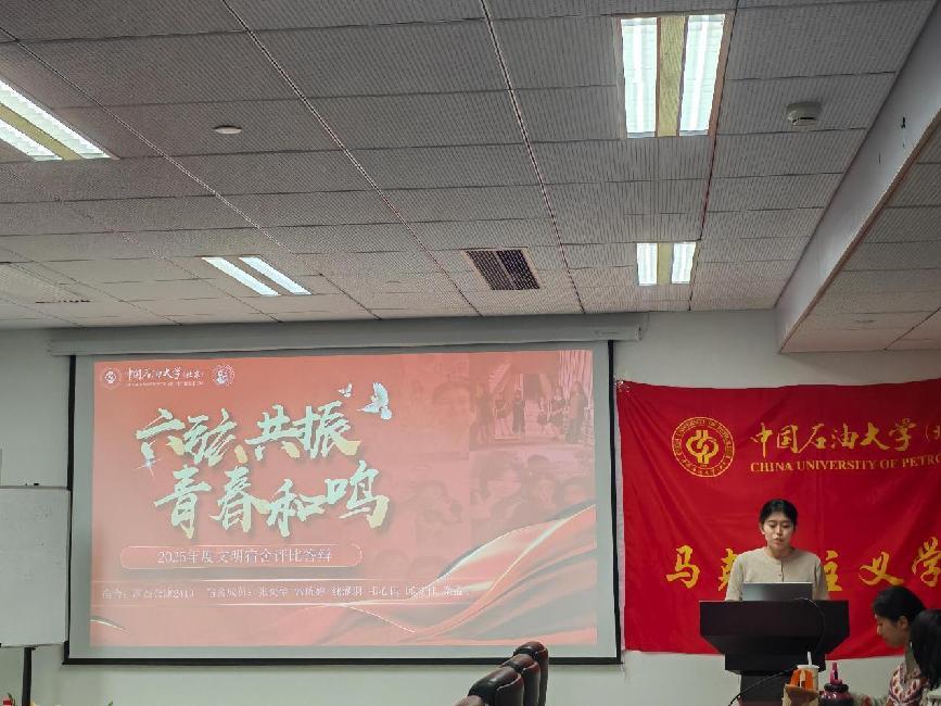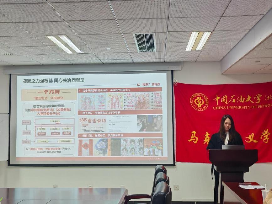 為營造良好宿舍氛圍,提高學(xué)生綜合素質(zhì),11月7日,中國石油大學(xué)(北京)馬克思主義學(xué)院在主樓B521舉行優(yōu)秀宿舍評比活動。潤杰2413宿舍代表張奕銘、青年園3309宿舍代表侯禹暢、青年園2305宿舍代表萬子晗、青年園3310宿舍代表喬琳舒依次進行答辯。馬克思主義學(xué)院團委書記劉彤彤,輔導(dǎo)員劉語燦擔(dān)任評委。