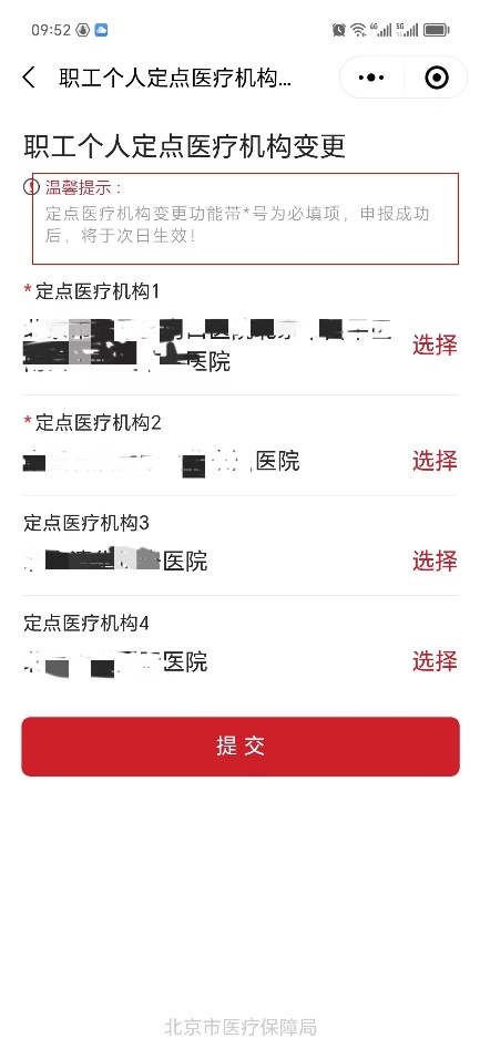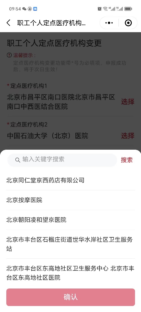 5.進(jìn)入后搜索醫(yī)院,點(diǎn)擊“選擇”后變更,系統(tǒng)提示申報(bào)成功,次日生效。