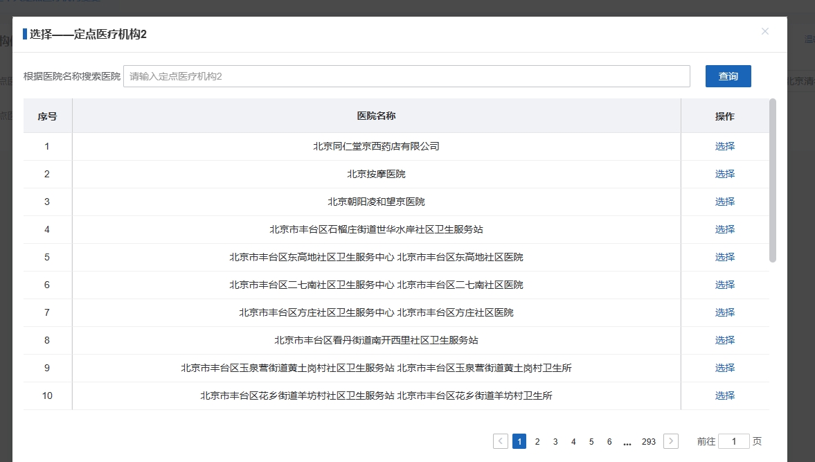 4.進(jìn)入后對(duì)需要修改的醫(yī)院點(diǎn)擊“選擇”.,在搜索頁(yè)面輸入醫(yī)院名稱