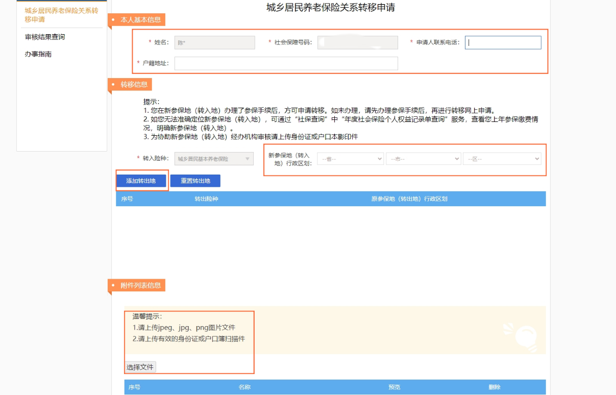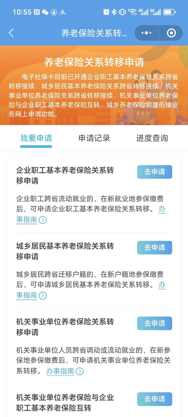 3. 進入后選擇申請(以城鄉居民養老保險關系轉入為例)