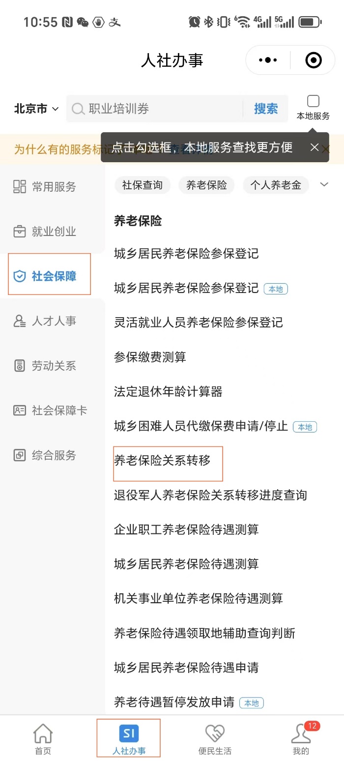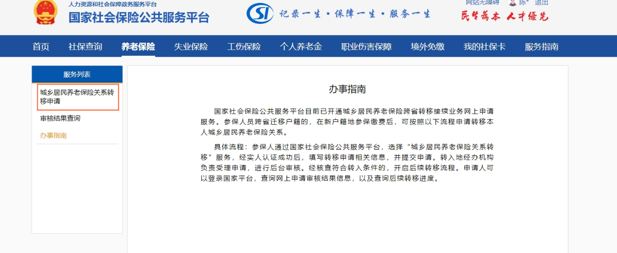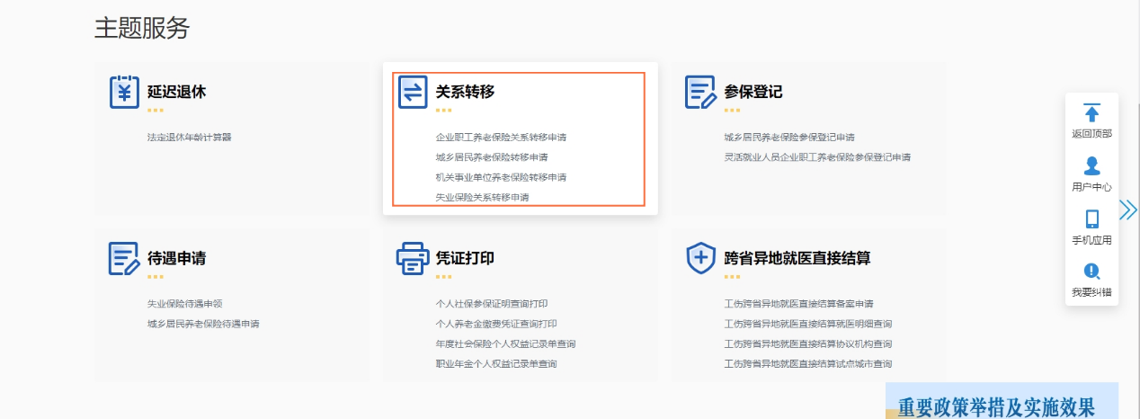 2. 在“人社辦事”模塊下,找到“社會保障”,選擇“養老保險”下的“養老保險關系轉移”。