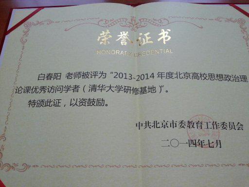 我院白春陽被評為“2013—2014年度北京高校思想政治理論課優秀訪問學者”