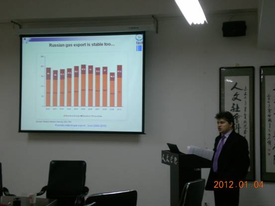 2012年1月4日下午,應我院國際石油政治研究中心邀請,俄羅斯能源部能源戰略研究院副院長阿列克謝·格羅莫夫為國際政治專業師生用熟練的英語作了題為《俄羅斯天然氣工業發展前景》的學術報告。格羅莫夫介紹了《俄2030年能源戰略》和俄氣天然氣發展戰略、俄天然氣出口戰略中的傳統歐洲市場和獨聯體市場、LNG出口戰略、東向戰略瞄準新興亞太市場及對華管道供氣管線方案以及氣源地建設、天然氣開發稅種和運輸費率問題等與我院師生進行了熱烈的互動式研討。中油集團中俄合作部天然氣專家出席了報告會并俄與專家就氦氣提取、俄氣價格公式和資源稅制進行了交流。