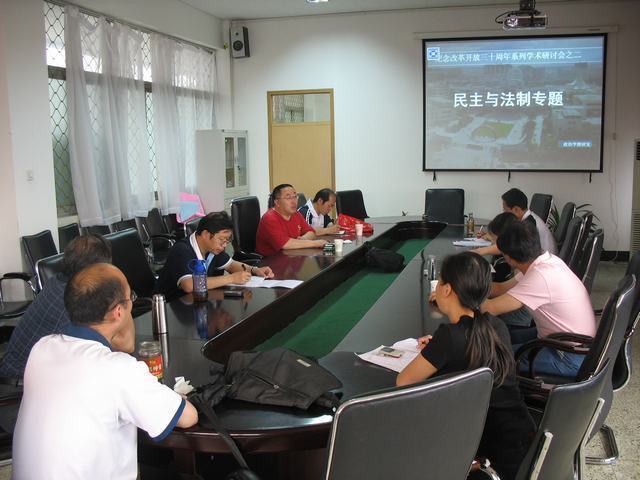 人文社科部政治學教研室“慶祝改革開放三十周年” 系列學術活動之二“民主、法制的理論與實踐研討會”于2008年6月5日下午2:30——5:30,在人文社科部會議室舉辦。會議由龐昌偉教授主持,部主任胡新華,部黨總支書記肖中瓊,部副主任李衛紅參加了會議,并就各個主題同教研室的老師們進行了深入的探討。