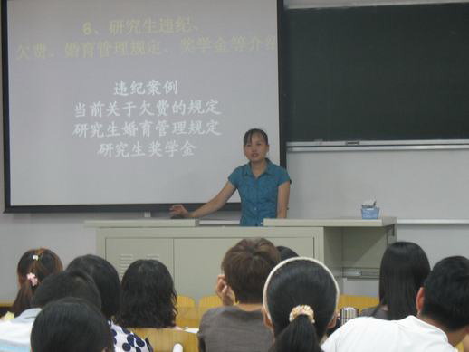 肖中瓊首先歡迎2009級的38名碩士研究生到校學習,結(jié)合學校、人文社科部研究生教育現(xiàn)狀對同學們提出新的希望。同時,肖書記運用豐富翔實的資料向2009級研究生介紹了學校和人文社科部的歷史、定位及發(fā)展,并著重從大學生文明道德、安全教育等等7個大方面進行了教育,并結(jié)合實例對新生提出要求和希望,希望大家迅速完成從本科生或職場人士到研究生的角色轉(zhuǎn)換。