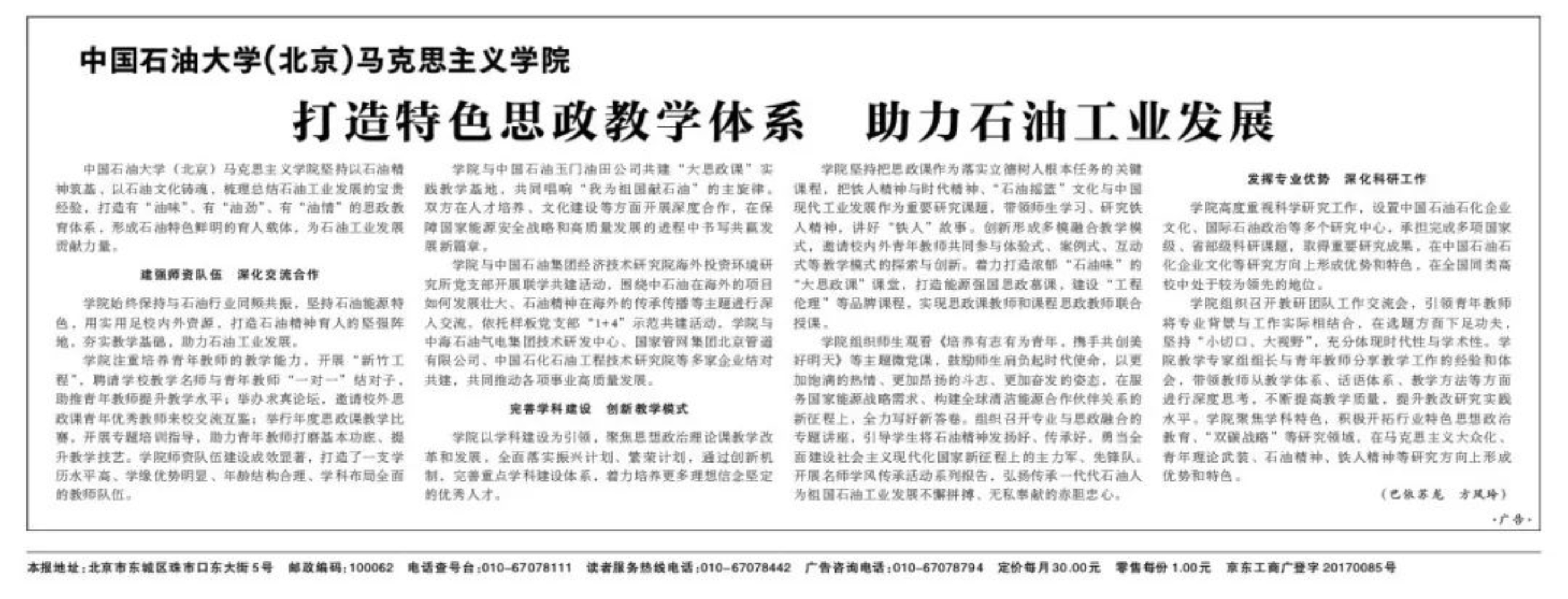 在習近平總書記發表“3·18”座談會重要講話五周年之際,光明日報刊發了介紹中國石油大學(北京)馬克思主義學院打造特色思政教學體系、助力石油工業發展的相關報道。