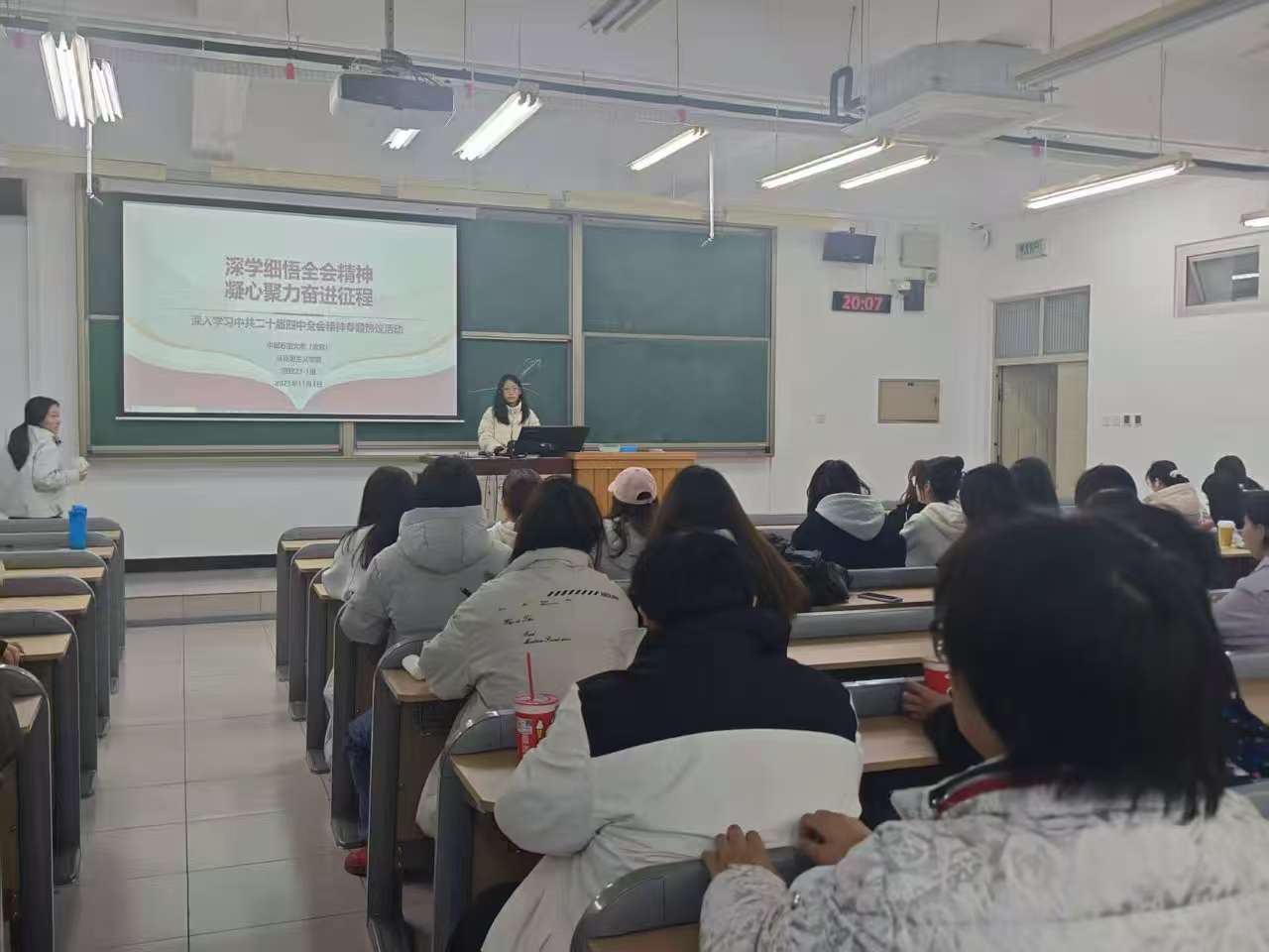 思政25-1班班主任姜林宏通過深入淺出的講解,幫助學(xué)生們領(lǐng)會(huì)黨的二十屆四中全會(huì)重要決策對(duì)于國(guó)家發(fā)展和民族復(fù)興的深遠(yuǎn)意義。他引導(dǎo)學(xué)生們深入思考“六個(gè)堅(jiān)持”基本原則在專業(yè)學(xué)習(xí)中的實(shí)踐內(nèi)涵,以及如何將基本原則轉(zhuǎn)化為推動(dòng)個(gè)人成長(zhǎng)和小我融入大我的實(shí)際行動(dòng)。同學(xué)們紛紛表示要將專業(yè)學(xué)習(xí)與國(guó)家戰(zhàn)略需求緊密結(jié)合學(xué)好專業(yè)知識(shí),在學(xué)習(xí)中充分感悟思想政治教育專業(yè)的價(jià)值引領(lǐng)屬性,堅(jiān)定政治信仰、塑造擔(dān)當(dāng)意識(shí)和培養(yǎng)創(chuàng)新精神。