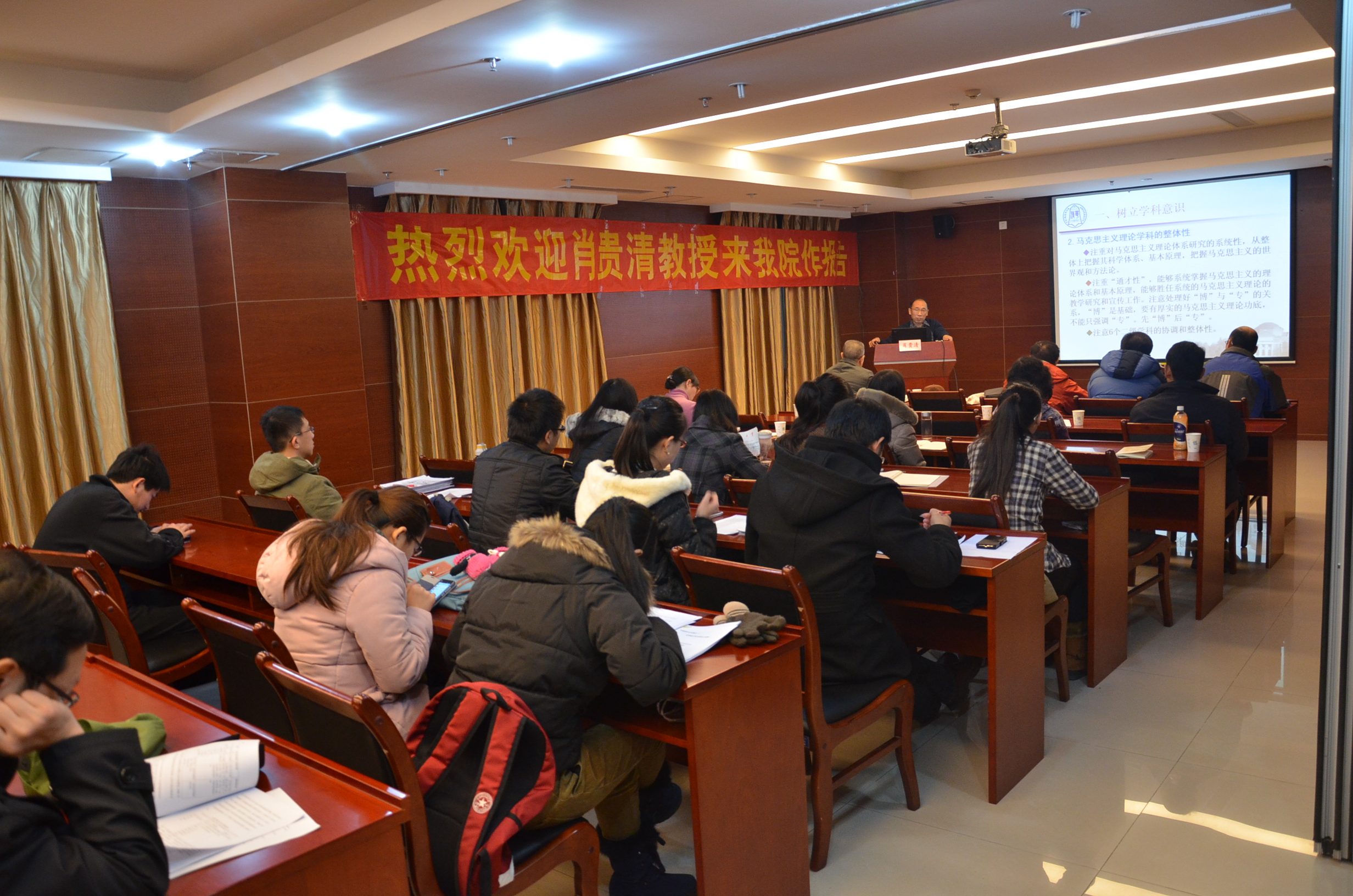 1月2日下午,應(yīng)我院邀請,清華大學(xué)馬克思主義學(xué)院副院長肖貴清教授在中油大廈311報告廳做了題為“馬克思主義理論研究方法”的學(xué)術(shù)講座。講座由我院董貴成教授主持,我院多名師生參加。肖教授首先介紹了清華大學(xué)馬克思主義理論學(xué)科建設(shè)的情況,并肯定了我院在馬克思主義理論研究方面所做出的努力和成果。隨后,他指出了目前高校馬克思主義理論學(xué)科建設(shè)中普遍存在的問題,提出要加強學(xué)科學(xué)風(fēng)建設(shè)。他還對馬克思主義理論一級學(xué)科下屬的六個二級學(xué)科各自的特點、側(cè)重點做了闡述,認(rèn)為要注意二級學(xué)科之間的協(xié)調(diào)性和整體性研究。肖教授重點闡述他對學(xué)科研究方法的看法,并對研究生論文寫作中的研究計劃的制定、研究范圍的確定以及研究方法的運用等給予了詳細的指導(dǎo)。