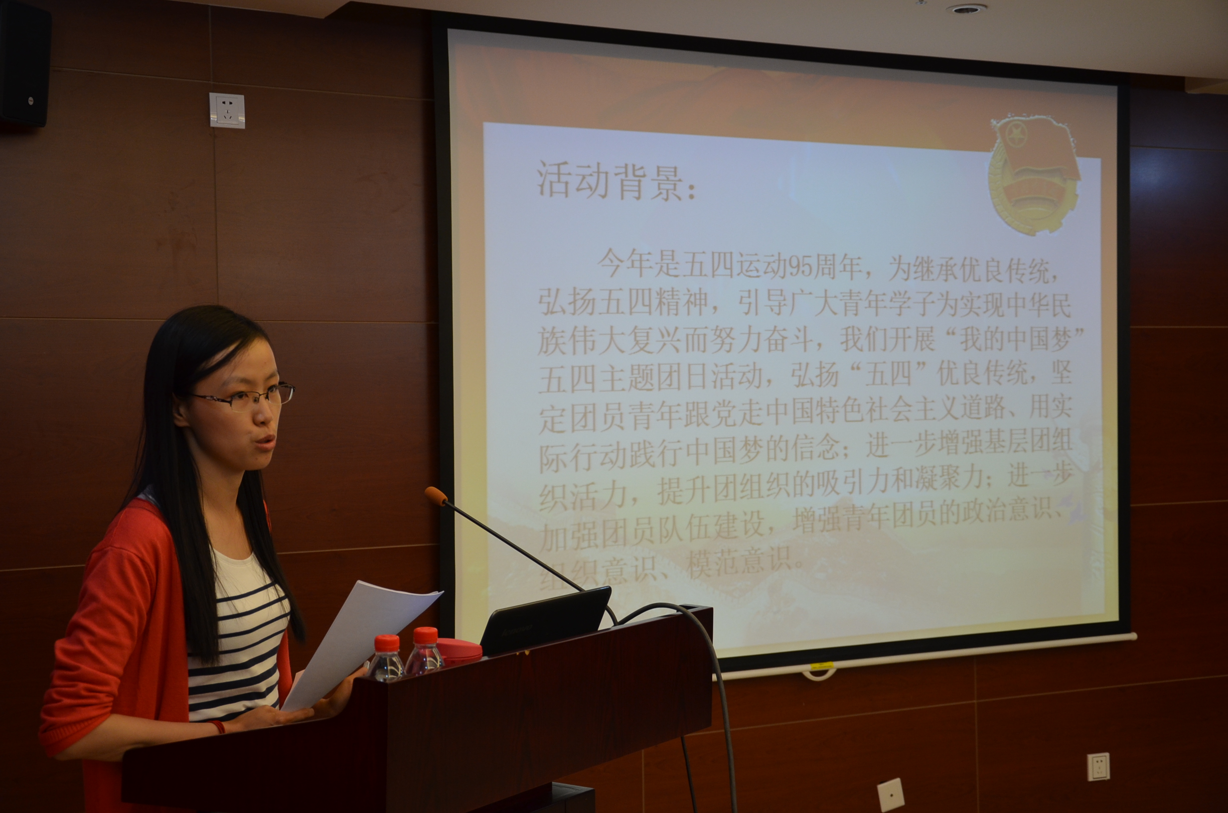 首先,由李一驍同學向同學們介紹了此次團日活動的主要目的,并向大家闡述了此次活動的意義。她說道:“今年是五四運動95周年,為繼承優良傳統,弘揚五四精神,引導廣大青年學子為實現中華民族偉大復興而努力奮斗,我院將開展以“激情五四,放飛中國夢”為主題的五四主題團日活動,弘揚“五四”優良傳統,堅定團員青年跟黨走中國特色社會主義道路、用實際行動踐行中國夢的信念;進一步增強基層團組織活力,提升團組織的吸引力和凝聚力;進一步加強團員隊伍建設,增強青年團員的政治意識、組織意識、模范意識。”