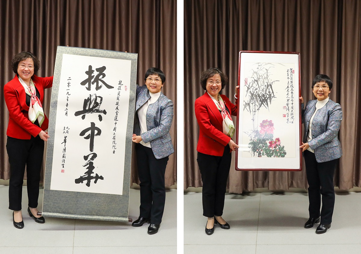 90歲高齡的華澤澎教授和82歲的余世誠教授,得悉三位校友當選院士的喜訊后非常高興,提筆潑墨為三位院士分別題字作畫。山紅紅向三位院士贈送了書畫作品。