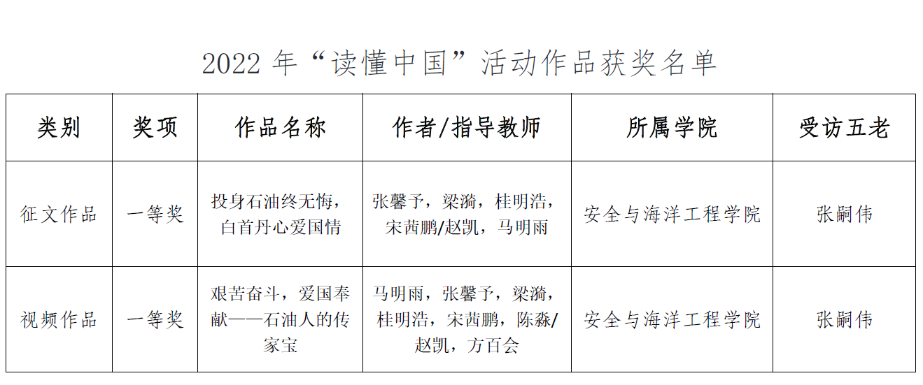 近日,中國(guó)石油大學(xué)(北京)關(guān)心下一代工作委員會(huì)公布了2022年“讀懂中國(guó)”活動(dòng)評(píng)審結(jié)果,安全學(xué)院報(bào)送的采訪張嗣偉教授兩份作品:征文《投身石油終無(wú)悔,白首丹心愛(ài)國(guó)情》、微視頻《艱苦奮斗,愛(ài)國(guó)奉獻(xiàn)——石油人的傳家寶》均獲校級(jí)一等獎(jiǎng)。
