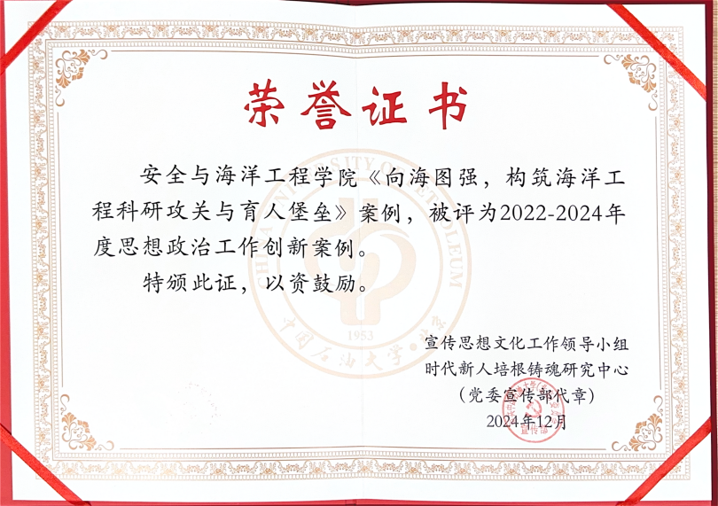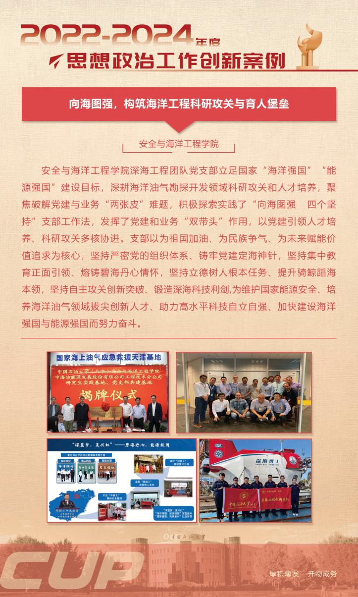 近日,中國石油大學(北京)黨委宣傳部、宣傳思想文化工作領導小組、時代新人培根鑄魂研究中心公布了2022-2024年度思想政治工作優秀成果與創新案例評選結果。安全與海洋工程學院深海工程團隊黨支部的《向海圖強,構筑海洋工程科研攻關與育人堡壘》案例獲評2022-2024年度思想政治工作創新案例。