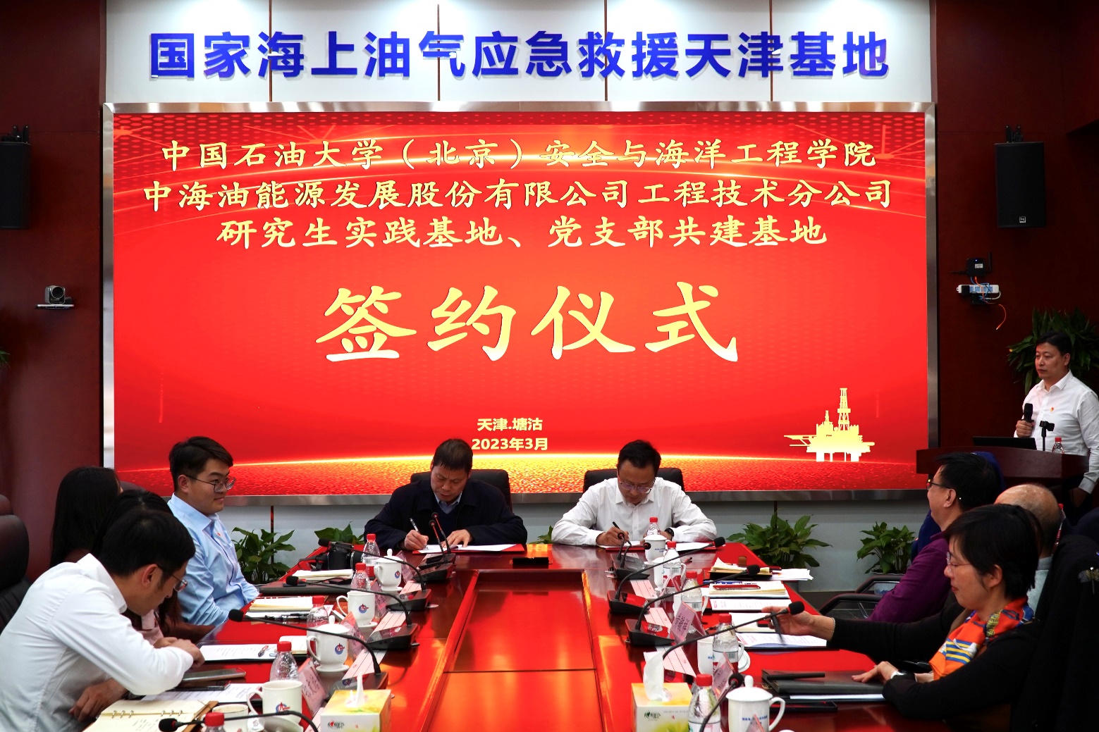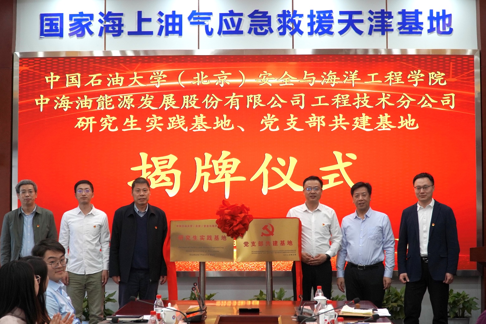 隨后,雙方簽訂了校企黨支部結(jié)對共建協(xié)議及研究生實踐培養(yǎng)協(xié)議。安全與海洋工程學(xué)院副院長楊進、鄭文培,機械與儲運工程學(xué)院副院長劉書海共同為井控中心與安全學(xué)院實習實踐基地揭牌。