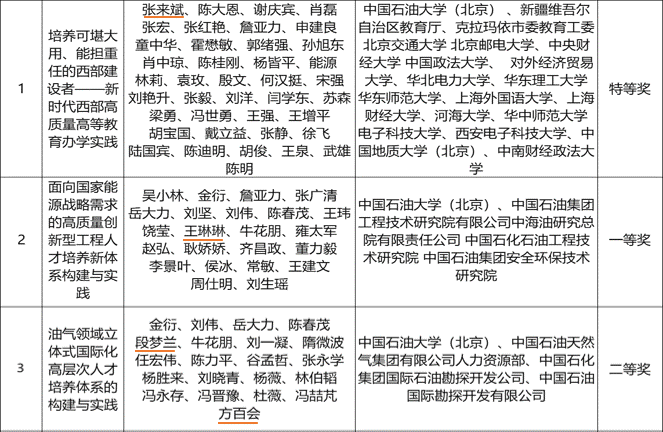 張來斌院士主持完成的“培養可堪大用、能擔重任的西部建設者——新時代西部高質量高等教育辦學實踐 ”獲特等獎,王琳琳教授參與完成的“面向國家能源戰略需求的高質量創新型工程人才培養新體系構建與實踐”獲一等獎,段夢蘭教授和方百會老師參與完成的“油氣領域立體式國際化高層次人才培養體系的構建與實踐”獲二等獎。