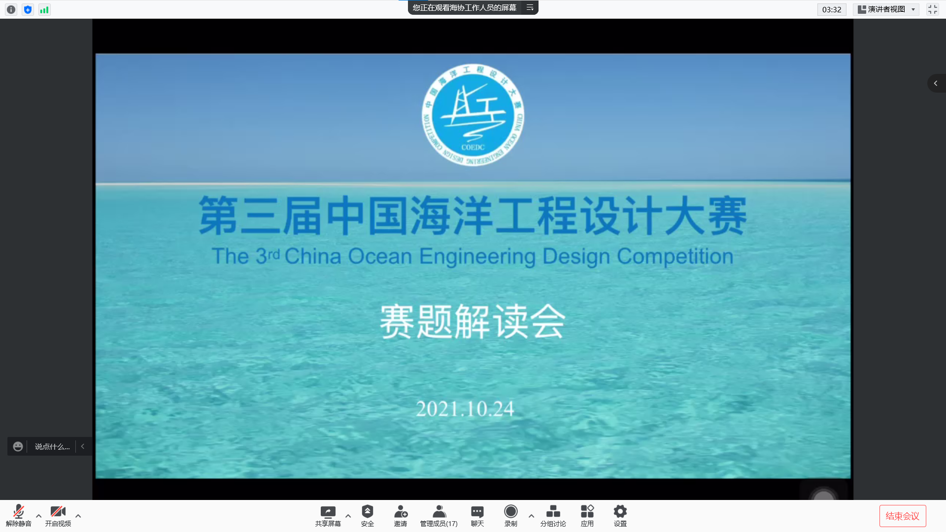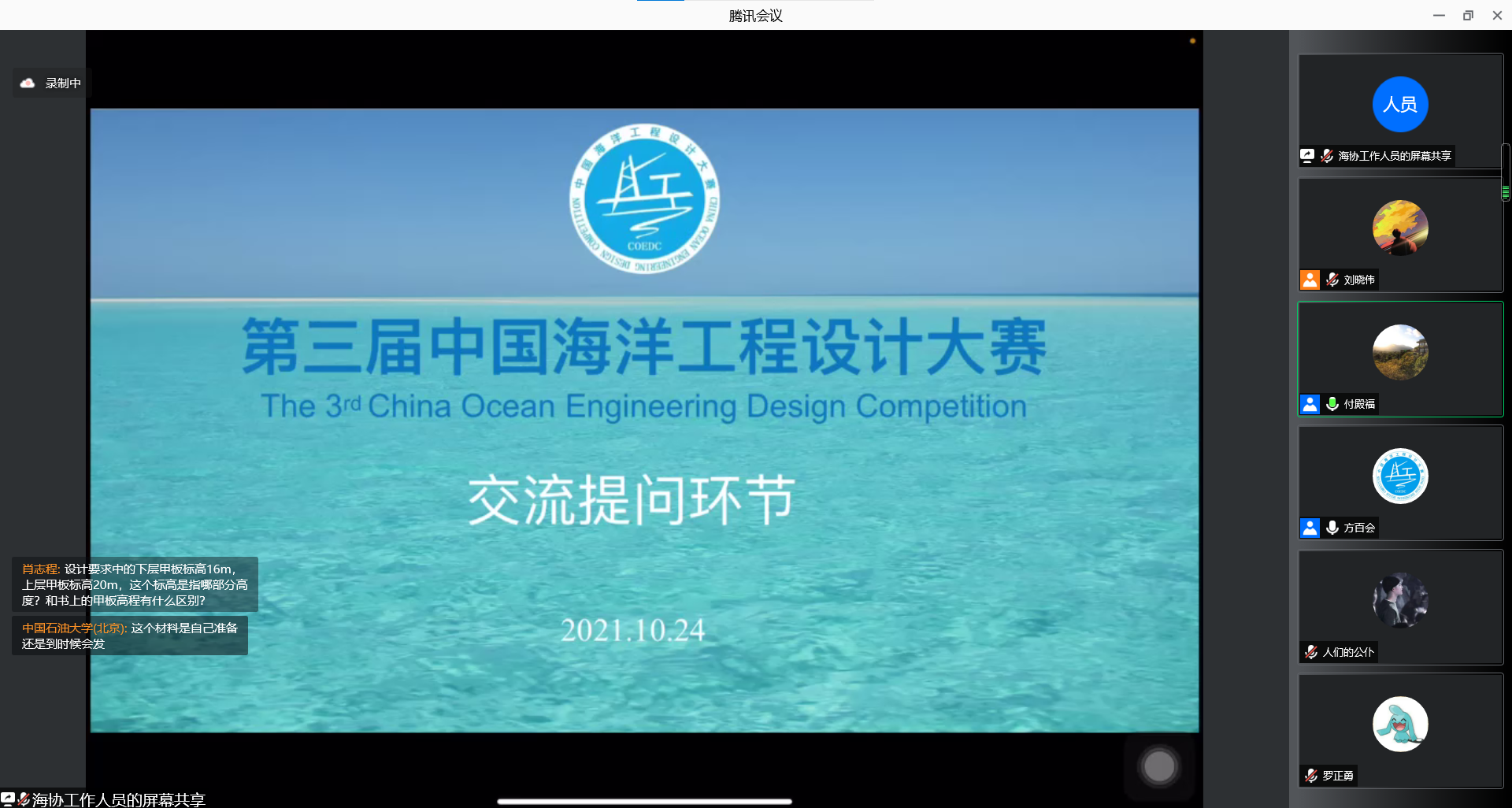 10月24日,由中國海洋工程設計大賽組委會主辦的第三屆中國海洋工程設計大賽賽題解讀會以線上會議的形式順利召開,本次賽題解讀會邀請到中海油研究總院工程設計院副院長付殿福擔任主講嘉賓,會議由大賽組委會工作人員、中石大安全學院團委書記方百會主持,各高校參賽選手和指導老師共計400余人參加了此次會議。