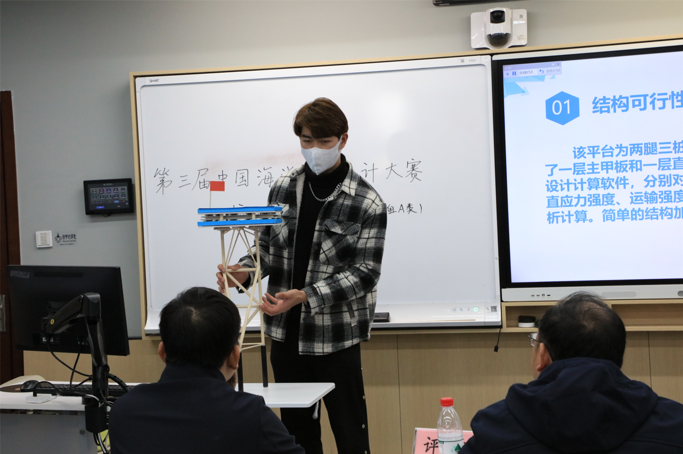 下午,設計制作組A類答辯環節在第四教學樓203室開展。各組選手分別從自身導管架平臺模型的設計背景、結構布局、創新點等方面展現自身作品的優勢。幾位評委老師從基礎理念性、創新利用性、現實可行性等方面進行提問,并就不同隊伍提出了改進意見。