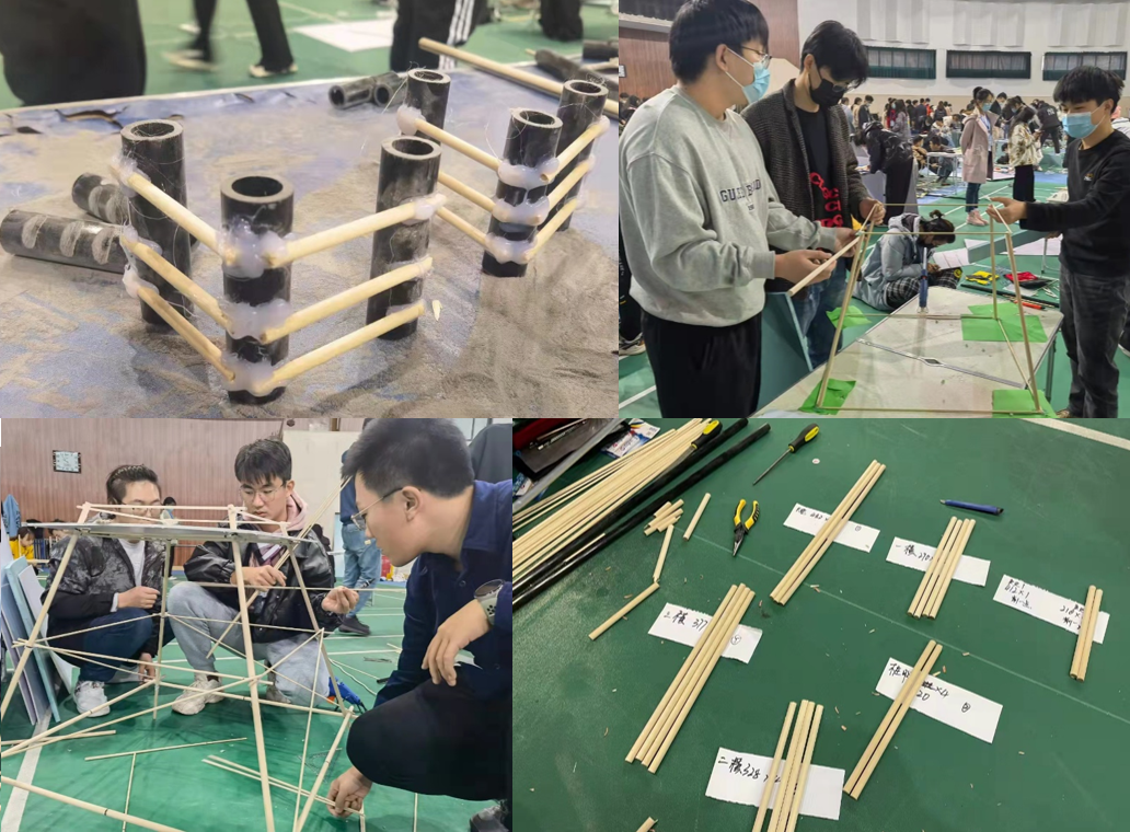 11月21日上午,大賽模型制作環節在體育館順利開展。各組選手分工明確,按照各組的設計理念,打磨導管架部件并組裝好自己的模型,充分展現了各位選手所掌握的專業知識。制作環節完畢后,評委帶領工作人員對各隊模型進行載荷測試,測得沙土下沉距離、前后傾角等數據,針對測試模型的穩定性、承載能力和實用性等方面進行科學考量。