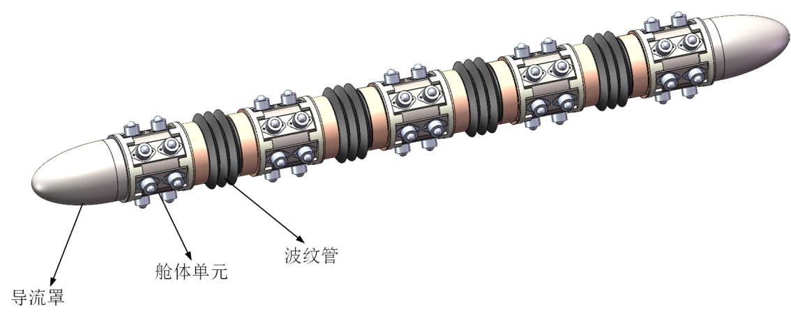 安全與海洋工程學院學生任牧雨同學在張玉教授的指導下,針對復雜海洋服役環境,設計了一種水下作業多關節蛇形機器人,該機器人由多個關節功能單元組成,每個功能單元艙體可搭載不同傳感器,根據水下執行任務需求可拆分重組功能單元,滿足不同復雜海洋環境中的多種作業需求。該機器人的每個功能具有兩個運動自由度,可完成偏航、俯仰兩種運動模式,多個單元關節相互疊加,可以合成多種運動模式,通過設計優化完成水中任意運動需求。為水下作業機器人提供了新思路、新構想、新方案。