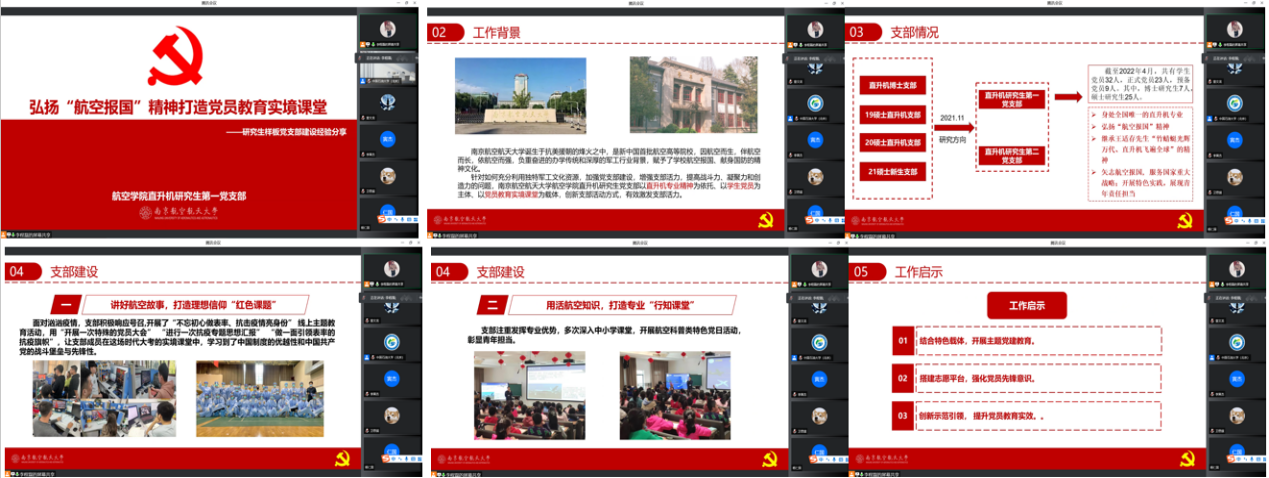 隨后,直升機研究生第一黨支部李程磊進行了“弘揚航空報國精神打造黨員教育實境課堂”研究生樣板黨支部建設分享。