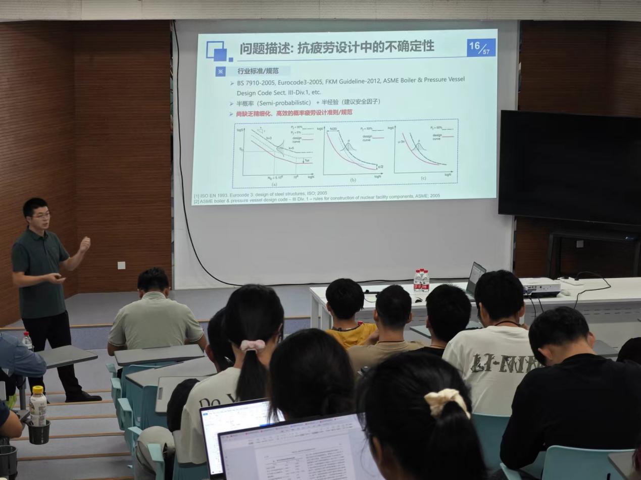 朱順鵬表示,為推進我國重大裝備自主研制進程,其關鍵結構壽命設計與可靠性評定迫切需要發展結構疲勞力學設計理論與性能評價方法。重大裝備熱端結構服役環境異常惡劣,同時,針對其構造異型、全尺寸試驗成本高、測試方法難以標準化以及多場-極端服役環境試驗無法開展等因素致使相關變形、疲勞壽命等數據嚴重不足及強分散現狀。朱教授結合多項工程應用案例,講述了重大裝備結構疲勞可靠性理論方法以及前沿進展。報告結束后,朱順鵬與在場師生就等比例縮小試驗、微裂紋監測與產生、結構與材料對應力集中影響等問題進行了互動交流。