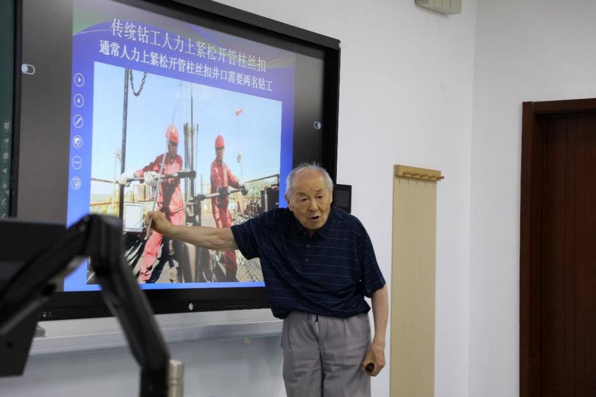在這次報告上,方華燦教授以豐富的理論知識和實踐經驗,深入淺出地闡述了我國渤海氣田勘探、采集技術的重大突破,介紹了渤海氣田分布廣、儲量大的現狀。他帶領師生了解了海上鉆井平臺的新技術與新發展,提出了“使用離岸能源供給綠電”“保護資源循環注氣”等海上鉆井平臺高質量發展的需要;提出了自動化智能鉆機在油氣田開發的廣闊前景,對比了傳統人力鉆工與先進“鐵鉆工”自動完成井口鉆工的差距;介紹了渤海水淺、平均深度低的現實難題,一針見血地指出了鋼圓筒沉箱、水下控制系統、淺水泥面下采油樹系統等關鍵技術發展的重要意義。