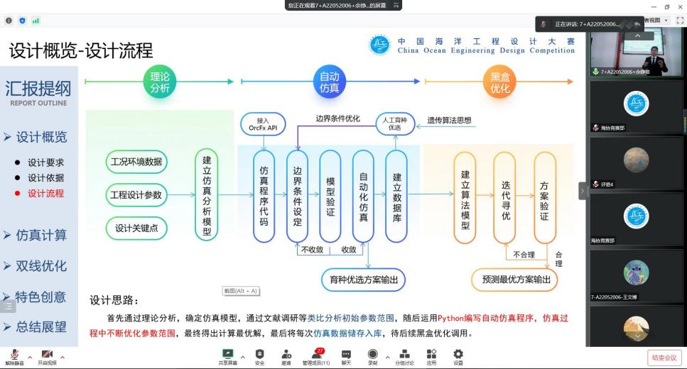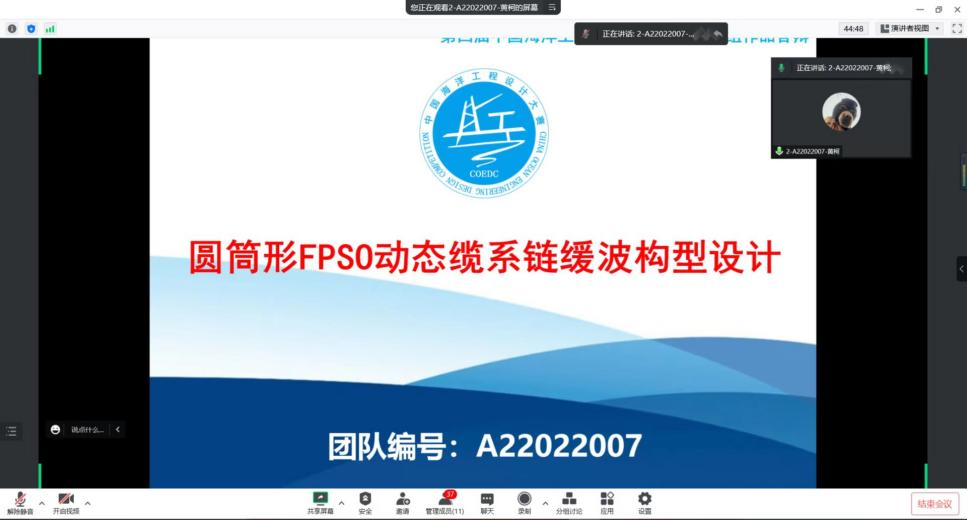 設計制作組以答辯形式開展比賽,來自中海石油(中國)有限公司北京研究中心、中國石油集團海洋工程有限公司的5位專家學者受邀出席,擔任本次決賽評委。各參賽隊伍以“圓筒形FPSO動態管纜設計”為主題,播放模型演算視頻,并從裝備結構、設計思路、模擬數據等方面對參賽作品進行了講解。各評審專家從作品的內容、科技創新性以及工程實踐性等方面進行提問,并對各參賽隊伍作了點評。