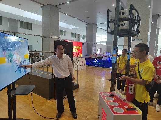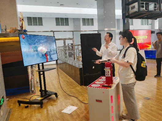同時,為提高新生們的安全防范意識,朱益指導大家進行了3D消防模擬演練。新生們按照“一提、二拔、三握、四壓”的口訣熟悉滅火器的使用過程,在實際操作中錘煉消防技能。
