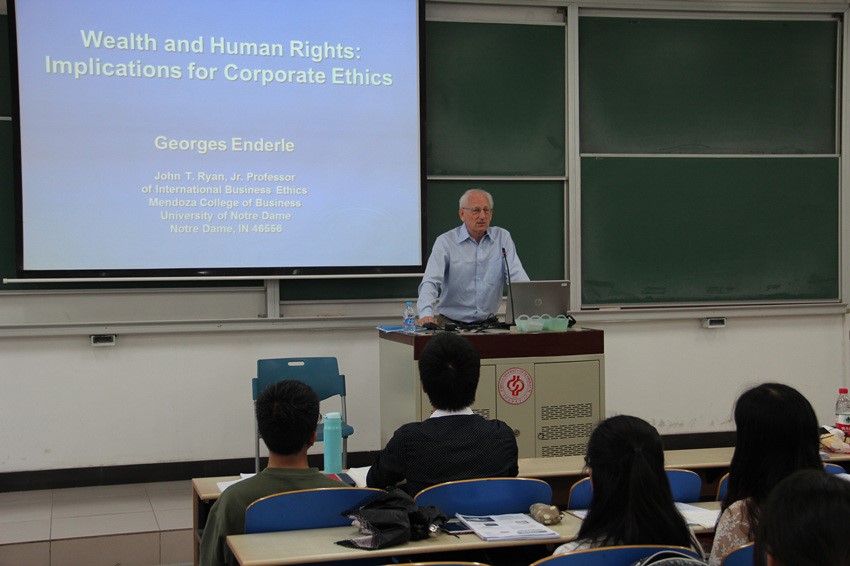 6月1日,應(yīng)工商管理學(xué)院牛琦彬老師之邀,來自美國圣母大學(xué)門多薩商學(xué)院的Georges Enderle教授來訪我校,給學(xué)生們開展了一次別開生面的講座。