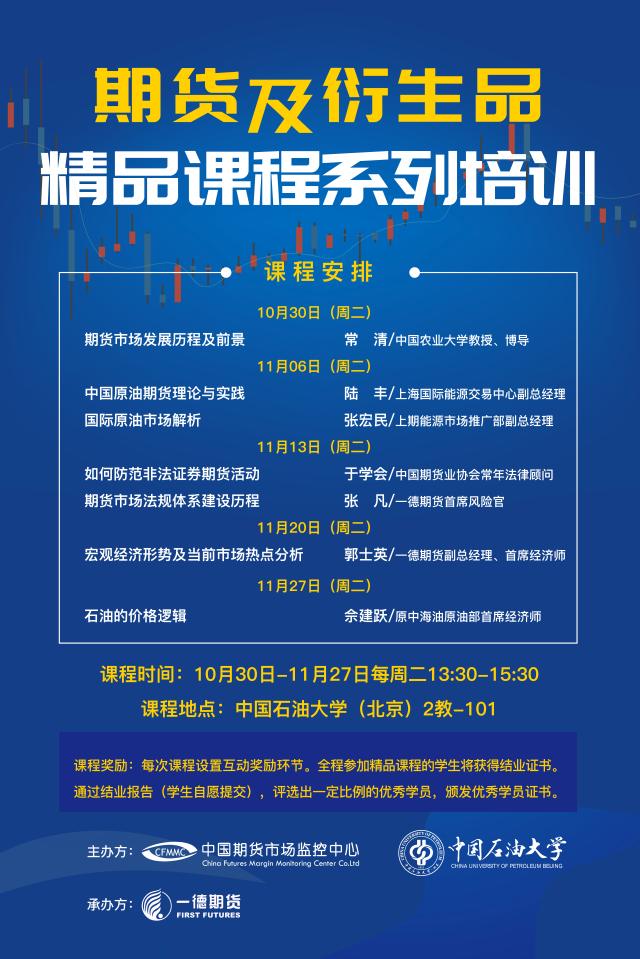 2018年10月30日,石大商學(xué)院聯(lián)合中國期貨市場監(jiān)控中心以及一德期貨公司共同舉辦了“期貨及衍生品精品課程系列講座”。本次講座由中國農(nóng)業(yè)大學(xué)常清教授主講。常清教授是中國期貨市場創(chuàng)始人,原國務(wù)院發(fā)展研究中心研究員、中國期貨業(yè)協(xié)會副會長、中國農(nóng)業(yè)大學(xué)期貨與金融衍生品研究中心主任、博士生導(dǎo)師。商學(xué)院郭海濤院長主持了講座,中國期貨市場監(jiān)控中心陳晶女士,一德期貨公司副總經(jīng)理趙未夏先生,一德期貨公司人力資源部總經(jīng)理陳亮先生,商學(xué)院沈慶寧副院長和齊明老師共同參加了此次講座。常清教授為商學(xué)院學(xué)生深入淺出的講授了我國以及國際期貨行業(yè)的發(fā)展歷史和行業(yè)特征,剖析了期貨行業(yè)對我國經(jīng)濟(jì)發(fā)展的積極推動作業(yè),并分析了行業(yè)發(fā)展的前景。講座結(jié)束后我校師生與常清教授進(jìn)行了熱烈的討論。中國期貨市場監(jiān)控中心還為參與期貨知識答題優(yōu)秀的同學(xué)準(zhǔn)備精致的禮品。本次講座是我校期貨及衍生品精品課程系列講座的第一講,講座對象全部為我校在校學(xué)生,目的是普及期貨知識,開拓學(xué)生視野,為學(xué)生發(fā)展開拓新的空間。學(xué)院將在后續(xù)四周分別邀請上海國際能源交易中心副總經(jīng)理陸豐先生和市場推廣部副總經(jīng)理張宏民先生,中國期貨業(yè)協(xié)會常年法律顧問于學(xué)會先生,一德期貨首席風(fēng)險(xiǎn)官張凡先生,一德期貨副總經(jīng)理郭士英以及原中海油原油部首席經(jīng)濟(jì)師佘建躍先生為我校學(xué)生開設(shè)講座。