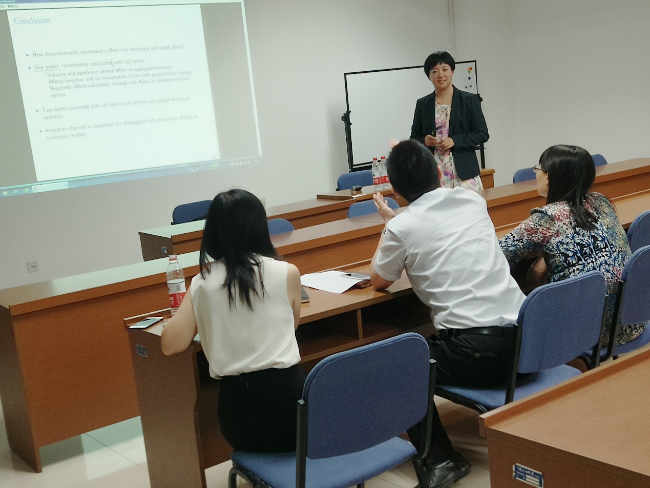 報告中,高琳以雙產業模型為展開,就石油價格波動對當下和未來經濟產出、投資、就業和消費產生的負面影響進行解釋,并從石油生產商在價格波動時的謹慎儲存效應的角度解釋了投資、生產、就業和消費的下降,資產價格隨之也下跌的現象。報告結束后,高琳就能源安全、金融衍生品市場研究現狀與在場師生進行了深入的學術交流。