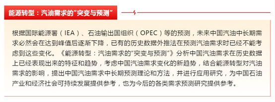 《能源轉(zhuǎn)型:汽油需求的“突變與預(yù)測(cè)”》是一本突出學(xué)術(shù)性、緊跟學(xué)科前沿、強(qiáng)調(diào)創(chuàng)新性的著作。該書(shū)以中國(guó)汽油中長(zhǎng)期需求為研究對(duì)象,針對(duì)中長(zhǎng)期汽油需求預(yù)測(cè)面臨的“外推法失效”問(wèn)題,全方位地評(píng)估了碳減排、污染物排放限制、汽車清潔能源技術(shù)、新型能源體系以及數(shù)字化等諸多方面對(duì)汽油需求的影響,提出了中國(guó)汽油中長(zhǎng)期需求的組合預(yù)測(cè)模型,預(yù)測(cè)了2020年到2060年中國(guó)的汽油需求數(shù)量,從理論上充實(shí)并極大地豐富了“中國(guó)能源轉(zhuǎn)型”的內(nèi)涵及其情景,全面分析了汽油需求的影響因素,理清了影響因素的相互關(guān)系和層次結(jié)構(gòu),構(gòu)建了基于突變理論的中國(guó)汽油需求預(yù)測(cè)理論和模型框架,并進(jìn)行了該理論的應(yīng)用研究。該書(shū)認(rèn)為,中國(guó)的汽油需求增長(zhǎng)率持續(xù)下降,汽油需求系統(tǒng)內(nèi)部發(fā)生了結(jié)構(gòu)性的變化,新能源汽車即將對(duì)汽油需求產(chǎn)生更大的規(guī)模替代。在此形勢(shì)下,對(duì)當(dāng)前和未來(lái)中國(guó)的汽油需求預(yù)測(cè)研究,迫切需求新的思想、新的理論和新的方法。正是在這一背景下,該書(shū)提出的中國(guó)汽油需求突變理論、應(yīng)用范式和預(yù)測(cè)方法,可以為當(dāng)前和未來(lái)相當(dāng)長(zhǎng)時(shí)間,我國(guó)能源、石油以及汽車行業(yè)的政策研究和制訂,為相關(guān)企業(yè)實(shí)施自身的發(fā)展戰(zhàn)略,提供非常有價(jià)值的參考和幫助。