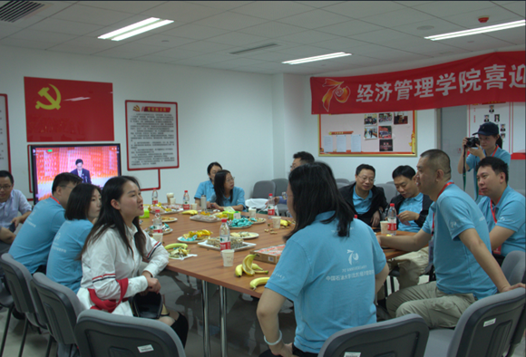 2號(hào)上午,李妙蘭、楊文慈、鐘國(guó)晶、穆會(huì)珍、陸軍、張寶生、鄧秀煥、郝洪、回淑玲等退休教師,劉璐、司瑞祺、趙厚學(xué)、嚴(yán)振鳴、安彩霞等老校友回歸闊別多年的校園,相聚在B1118會(huì)議室,與陳大恩、朱義清、馬春愛等領(lǐng)導(dǎo)及十余位教師共同觀看建校七十周年慶祝大會(huì),共憶難忘的往日時(shí)光,共敘求學(xué)、工作中結(jié)下的美好情誼、共商學(xué)院未來發(fā)展,為學(xué)校七十華誕送上祝福。
